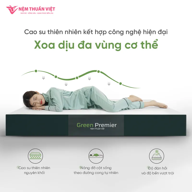 Nệm cao su thiên nhiên Thuần Việt Green Premier là lựa chọn hoàn hảo cho những ai tìm kiếm các sản phẩm lành tính từ thiên nhiên, cảm nhận sự êm ái và nâng đỡ tối đa cho cơ thể. Nệm phù hợp với mọi lứa tuổi, đặc biệt với những người đau nhức vùng lưng và hầm nóng khi ngủ.