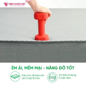 Thiết kế dạng cấu trúc tế bào mở với 2 mặt lỗ tròn giúp nệm thông thoáng, khí nóng không bị giữ lại bên trong, tăng khả năng thấm hút và thoát nhiệt cao, duy trì mặt nệm luôn khô thoáng, không còn sự hầm bí, khó chịu nằm.
